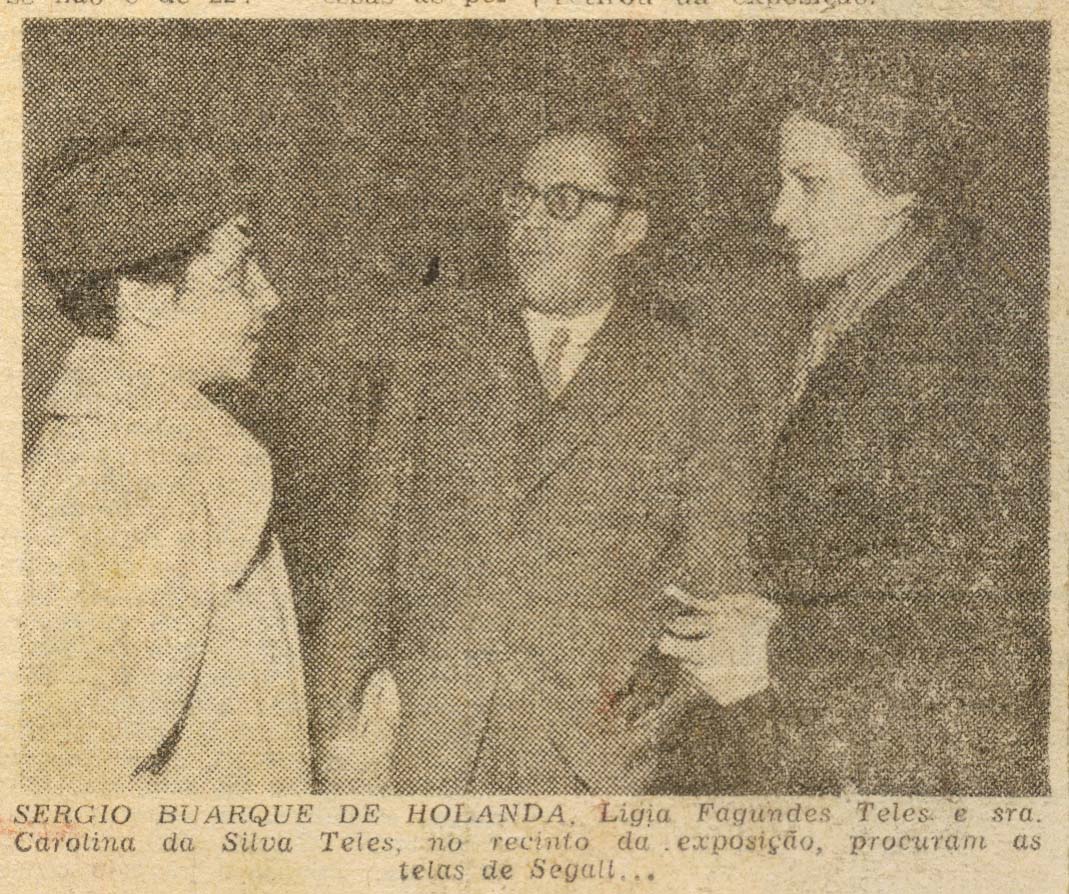 Sérgio Buarque de Holanda; Lígia Fagundes Teles e Sra. Carolina da Silva Teles; no recinto da exposição; procuram as telas de Segall