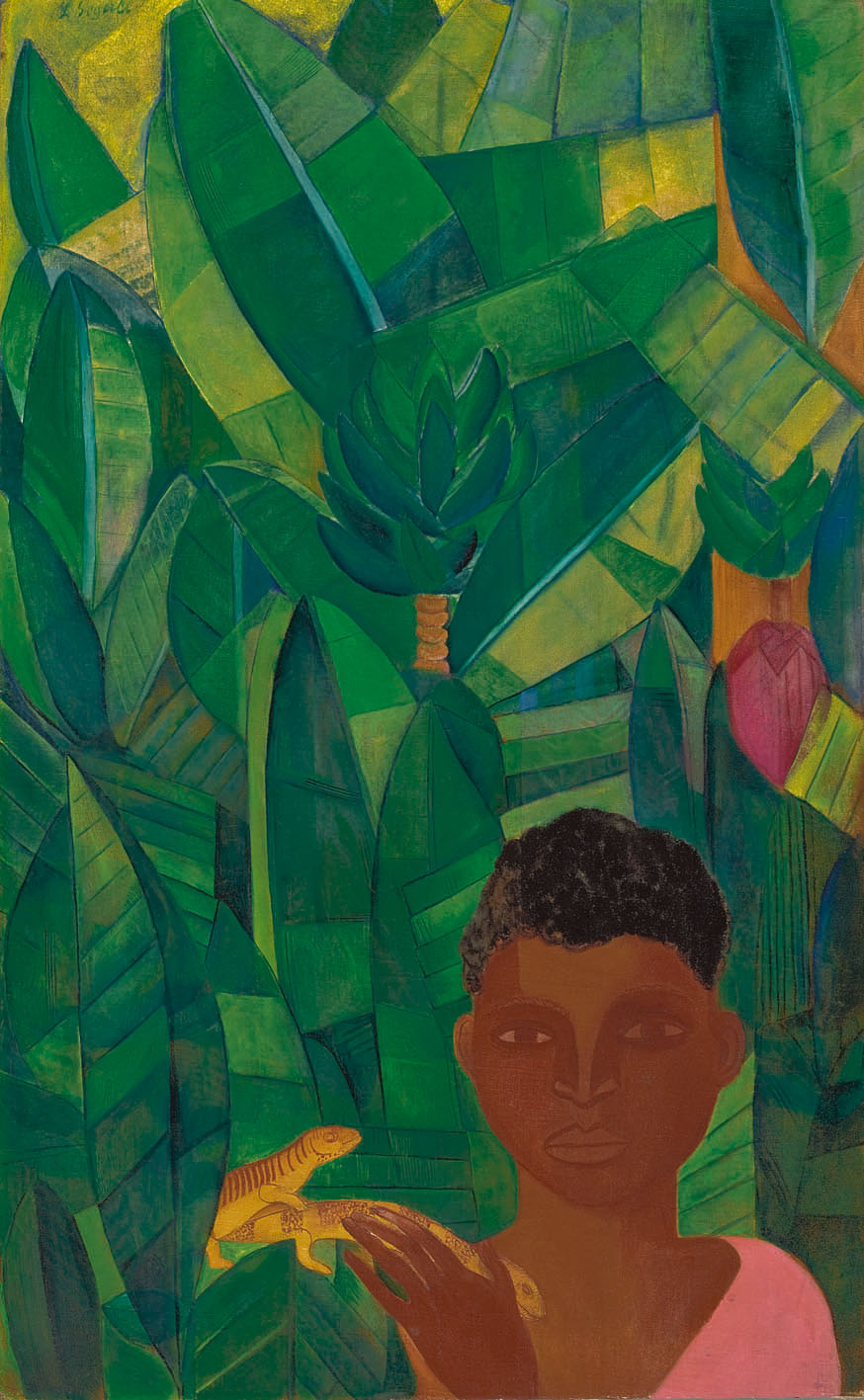 Composição nos tons predominantemente verdes, terras, amarelos, rosas, ocres, vermelho e preto. Textura lisa, frisos escuros contornando principalmente as folhas. Composição representando meio busto do menino negro com lagartos, ocupando a metade inferior direita da composição em meio a um bananal. O menino está de frente, tem cabelos escuros encaracolados, olhos amendoados, nariz pontiagudo e lábios grossos fechados. Usa blusa de tons rosados e está com a mão direita segurando um dos lagartos sobre o ombro esquerdo. O outro se encontra mais à esquerda sobre posto ao primeiro. Os lagartos são amarelos com detalhe em vermelho. O bananal é representado por grandes folhas quase geometrizadas em diversos tons de verdes e amarelos superpostos. No centro da composição, penca de banana verde voltada para o alto e mais à direita outra penca menor com coração cor de rosa, por cima do que parece ser o caule de uma bananeira