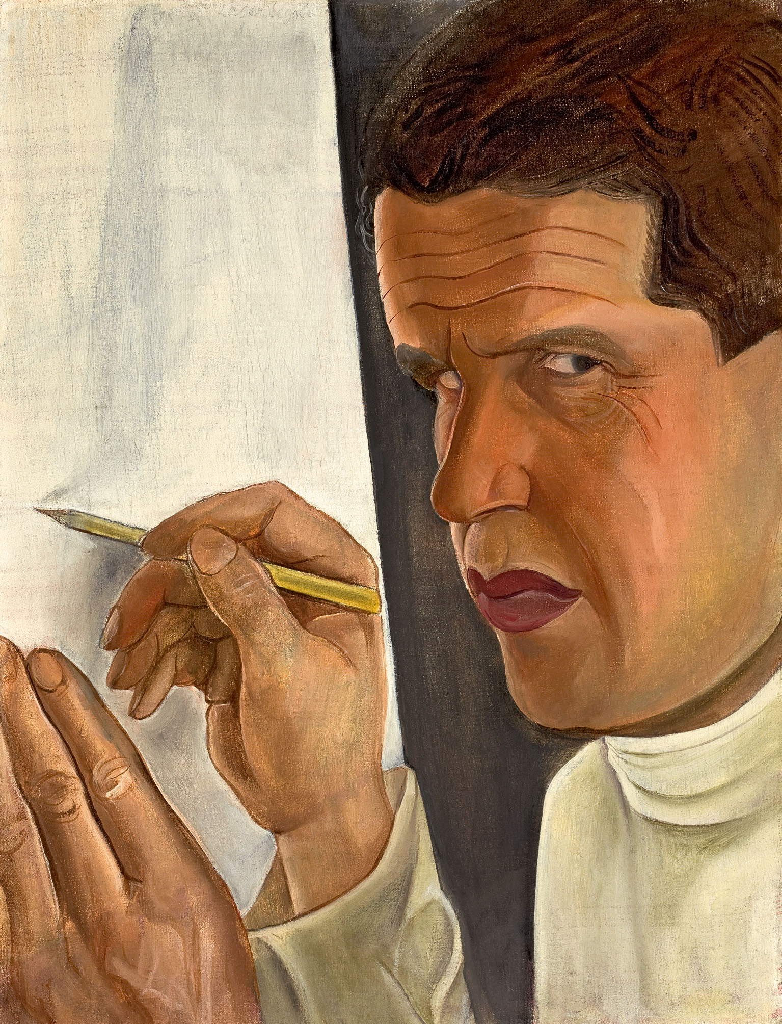 Composição nos tons cinzas, terras, azuis, amarelo e verdes. Textura lisa e pinceladas marcadas. Composição representando auto-retrato, aonde o artista desenha sobre uma tela clara, contra fundo escuro. A figura ocupa a área esquerda da composição; está quase de perfil para a esquerda com os olhos voltados para a direita como se observasse o motivo sobre o qual desenha. Tem cabelos castanhos curtos, testa marcada por rugas de expressão, sobrancelhas caídas, olhos pequenos, nariz grande, lábios grandes e bem desenhados e coloridos em tons avermelhados. Usa camisa branca de gola alta. No canto inferior esquerdo pode se ver três dedos de sua mão esquerda apoiando a tela, onde parece desenhar com a mão direita que segura o lápis amarelado. A tela ocupa o lado esquerdo da composição e é representada em branco com manchas azuladas. No fundo, entre a tela e o retratado, área em tom cinza chapado