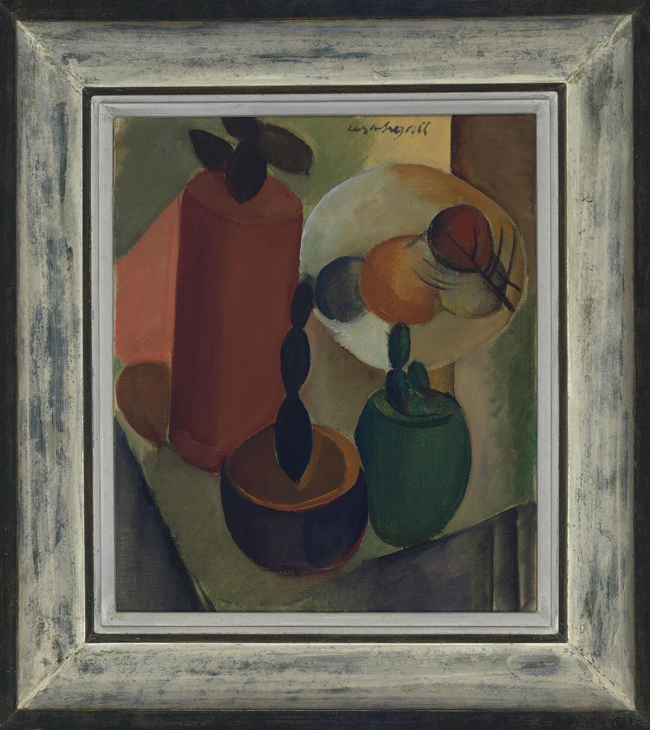 Composição nos tons verdes, ocres, cinzas, amarelos, rosas e preto. Textura lisa, tela ligeiramente aparente em um dos vasos. Composição com elementos geometrizados, representando natureza morta com três vasos de cactos e uma fruteira, provavelmente em cima de uma mesa contra fundo composto por áreas em diversos tons. Sobre a mesa de tons esverdeados, ao centro, vaso escuro, abaulado e baixo de onde nasce um cacto de três folhas escuras, uma sobre a outra; à direita do centro, vaso verde, abaulado, um pouco mais alto com cacto de três folhas; mais atrás, à esquerda, grande vaso cilíndrico de tom terra avermelhado com cacto escuro de quatro folhas; à direita, suposta fruteira circular com quatro frutas indefinidas dentro. No fundo, áreas coloridas da esquerda para a direita, rosa, verdes, amarelo e terra