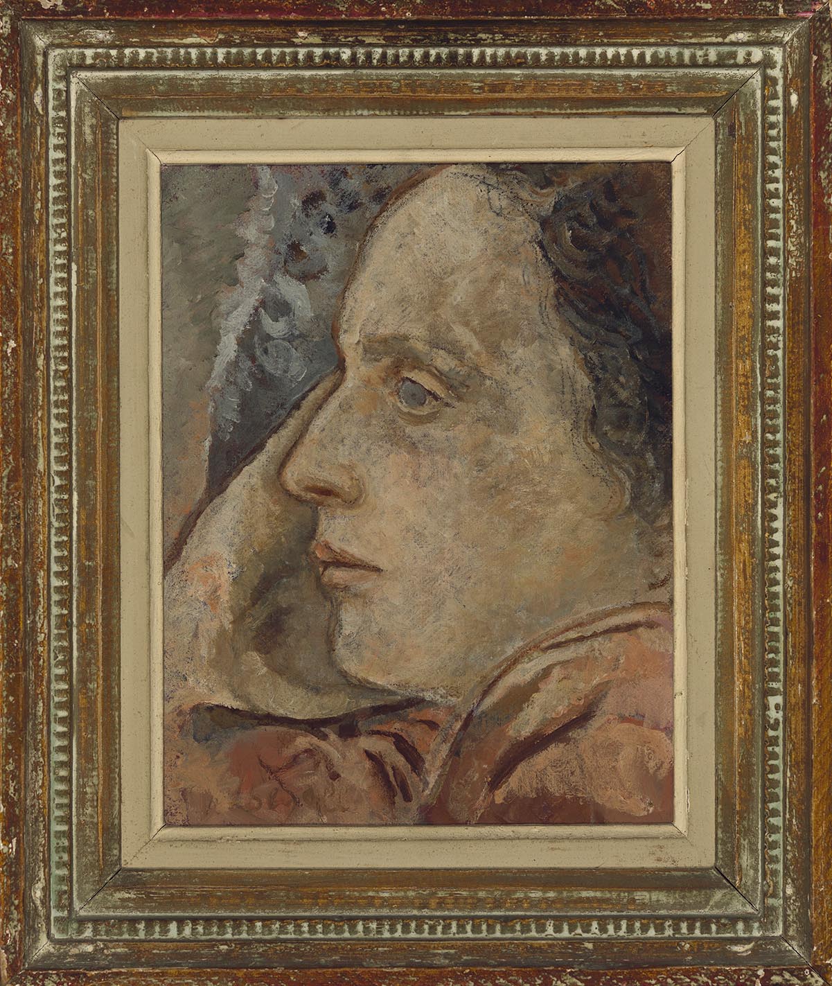 Composição nos tons cinzas, ocres, terras e preto. Textura ligeiramente áspera de areia em alguns pontos e pinceladas marcadas. Retrato de perfil de cabeça de mulher, sangrando às margens direita e superior da composição, com fundo de tons acinzentados no canto superior esquerdo. A retratada está de perfil para a esquerda e pode-se ver pequena parte de seus cabelos contornando o rosto. Tem a testa larga, sobrancelha fina, olhos claros, nariz demarcado no perfil, lábios fechados e queixo curto. O pescoço fica encoberto provavelmente pelo ombro direito do qual se pode ver a continuação do braço contornando o rosto. Usa roupa de tons ocres e terras. No centro superior esquerdo, fundo indefinido de pinceladas marcadas em tons acinzentados