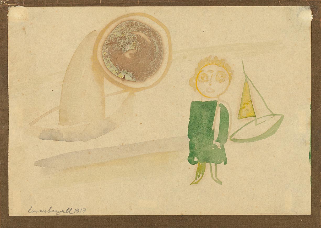Composição nos tons aquarelados de verdes, cinzas, ocres e amarelos. Aquarelado denso principalmente na figura e bem diluído nos demais elementos. Composição representando cena com uma criança, provavelmente um menino, com dois barcos sugeridos, duas faixas indicando água e um grande sol. No primeiro plano, à direita do centro, menino de pé, de frente, com cabelos encaracolados e traços fisionômicos sugeridos em amarelo, usando roupa de tons esverdeados. No segundo plano, à esquerda, sugestão de barco à vela que flutua sobre duas faixas, uma em tons acinzentado e outra de tom ocre que sugerem omar e a areia. À direita do centro, grande círculo sugerindo um solo de tons ocres mais escuros no centro devido ao suporte em que está colado. À esquerda, barquinho menor de tom verde e vela amarela