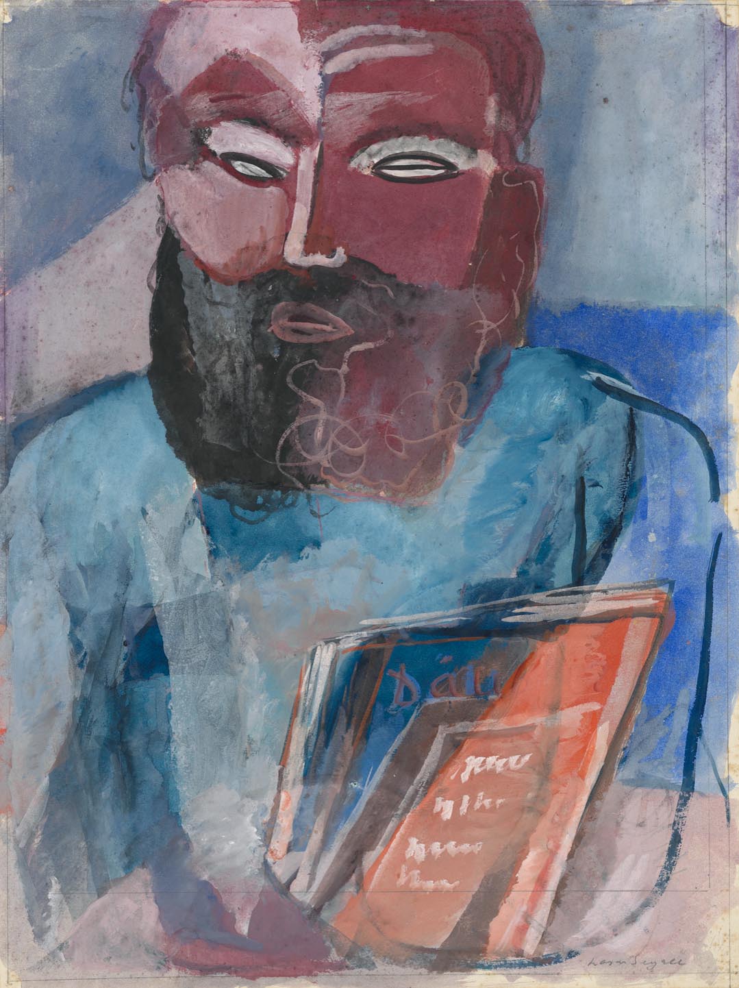 Composição nos tons azuis, carmim, vermelho, preto, cinza e branco. Áreas densas com diversos tons superpostos e áreas mais diluídas principalmente no fundo. Retrato de meio busto do poeta Däubler, ocupando a quase totalidade da composição contra fundo de tons azuis e lilases. O retrato está de frente, tem a tez representada em tom carmim, mais claro na face direita, provavelmente por incidência de luz. Tem os olhos pequenos, nariz pequeno e anguloso, lábios finos sugeridos, em meio a densa barba escura na face direita e de tons carmins acinzentados na face esquerda. Usa roupa em tons azuis, onde está demarcada a linha do ombro e do braço esquerdo, com o qual segura provavelmente um livro, onde se pode ver parte de uma inscrição: “Däu”, sobreposta por área avermelhada com sugestão de inscrições em branco. No fundo à esuerda área lilás sobreposta: por área azul. À direita de tons azulados