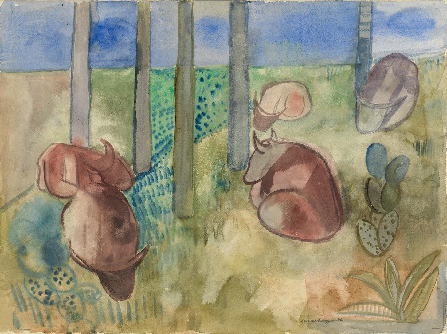 Composição nos tons verdes, ocres, terras azuis e cinzas. Linhas de contorno delimitando as formas e aquarelados bem diluídos e mais densos preenchendo os espaços. Composição representando paisagem de campo aberto, com cinco animais bovinos deitados em meio a troncos de árvores, com cactos representados tendo ao fundo faixa azul sugerindo céu. No primeiro plano, no canto à esquerda cacto com a região superior bem diluída. Mais à direita dois dos animais, o primeiro com a cabeça para frente e com chifres sugeridos; o segundo com a cabeça para direita, também com os chifres e cauda indicados. Um pouco mais atrás o primeiro dos quatro troncos, representados por faixas verticais. À direita do centro, o terceiro, deitado de costas com a cabeça com chifres quase de perfil para esquerda. Ao seu lado, cacto de sete folhas superpostas. No canto inferior direito, folhagem em tons verdes claros. No segundo plano, à esquerda, a continuação do pasto e à direita do centro os dois últimos, deitados quase de frente. Atrás do da direita, um último tronco. No fundo, faixa de tons azulados representando céu