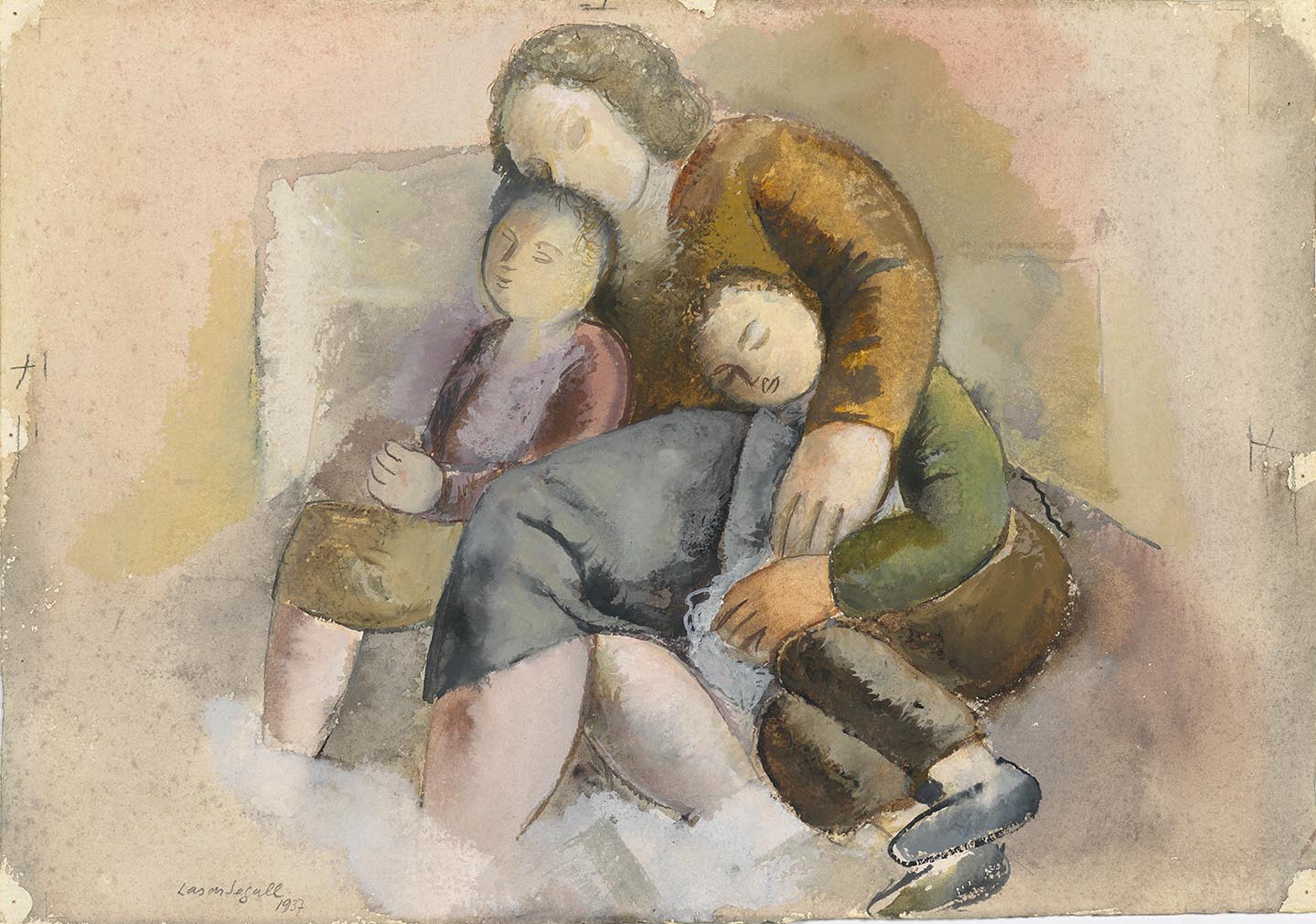 Composição nos tons cinzas, ocres, lilases, rosas, terras, branco e preto. Linhas de contorno definindo as formas, preenchidas por pinceladas densas e opacas nas figuras e aquarelados no fundo. Composição representando uma mulher e dois meninos repousando no que parece ser uma cama entre almofadas ocupando a área central da composição com aquarelados diáfanos no fundo. A mulher está no centro, com o corpo flexionado, com a cabeça apoiada no menino da esquerda, com os quadris para direita onde se apóia o menino da direita e com as pernas para esquerda, sendo que a perna esquerda está sobre a direita. Tem cabelos castanhos claros ondulados, traços fisionômicos ligeiramente sugeridos. Uma blusa de tons ocres, saia de tons cinzas, está com o braço direito apoiado no menino da direita e os seus pés não estão definidos. A figura da esquerda estã sentada três quartos voltada para esquerda, com o corpo apoiado ao da mulher. Tem cabelos claros, traços fisionômicos sugeridos, usa blusa de tons lilases e calça curta de tom ocre e também não tem os pés indicados. O menino da direita está quase deitado, tem cabelos sugeridos, está de olhos fechados, usa blusa de tons verdes, com o braço esquerdo flexionado apoiado nas pernas também flexionadas; usa calça de tom terra e sapatos acinzentados. O grupo se encontra recortado sobre almofadas sugeridas em tons lilases, cinzas e ocres