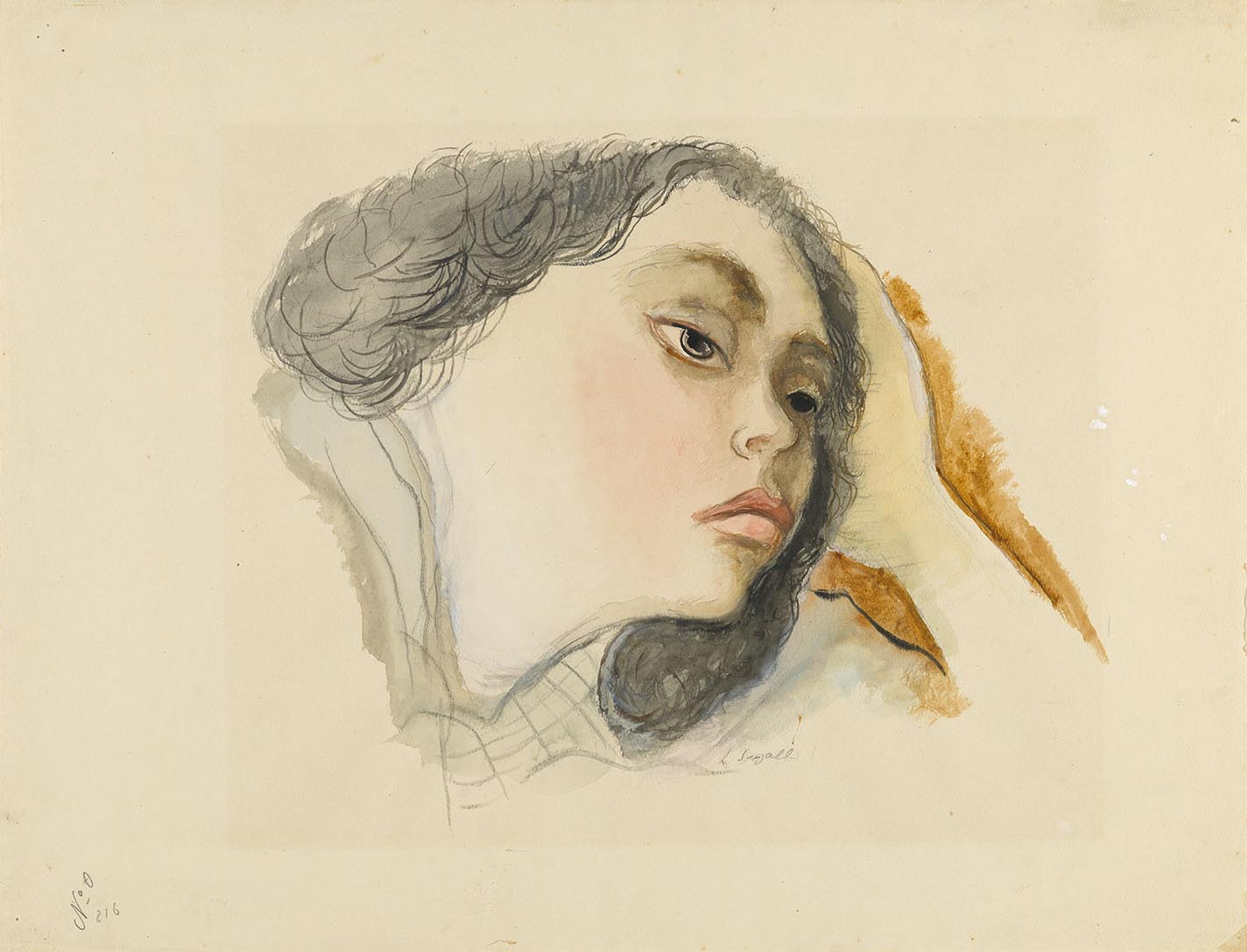 Composição nos tons cinzas, ocres, rosas, amarelos, preto e branco do papel. Textura lisa, aquarelado bem diluído, áreas mais densas e pinceladas marcadas principalmente no cabelo. Cabeça de mulher apoiada na mão, ocupando a área central do suporte, com fundo aquarelado contornando a figura e contra o suporte liso. A figura está com a cabeça três quartos voltada para direita, ligeiramente caída e apoiada na sua mão esquerda, sugerida e encoberta pelos cabelos. A figura tem cabelos escuros, ligeiramente encaracolados que lhe contornam o rosto. Tem as sobrancelhas sugeridas, olhos amendoados, nariz pequeno e arrebitado, lábios grossos e rosados e queixo pequeno e arredondado formando uma mesma linha com o pescoço, devido a posição de sua cabeça. Contornando parte do braço e da mão, tons ocres mais densos; contornando a região do pescoço, tons esverdeados demarcados por pinceladas de tom cinza sugerem sua vestimenta e traço largo preto sugere o ombro esquerdo