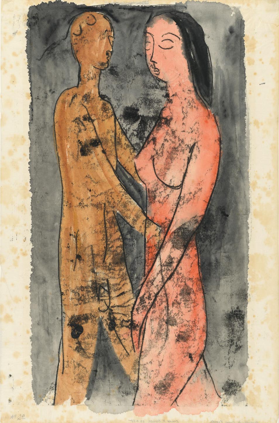 Composição em tons cinzas, ocres, laranjas e preto. Linhas de contorno das figuras em monotipia – desenho cego e manchas irregulares por toda composição, aquarelados preenchendo as formas e o fundo. Composição representando um homem e uma mulher nus, um de frente para o outro, ocupando a área central da composição contra fundo de aquarelados em tom acinzentado. O homem está a esquerda, de pé, quase de perfil para direita. Tem cabelos e traços fisionômicos sugeridos, é uma figura esguia, está com os braços estirados em direção à cintura da mulher que está a sua frente, como se fosse abraça-la. Tem o corpo preenchido em tons ocres, está com as pernas ligeiramente afastadas, sendo seus órgãos genitais representados. À direita, um pouco mais à frente, a mulher de pé, quase de perfil para a esquerda. Tem cabelos escuros, semi-longos, tez avermelhada, traços fisionômicos sugeridos, pescoço largo e seios grandes demarcados. Está com o braço esquerdo ao longo do corpo, coma mão evolvendo o seu órgão genital; está com a perna esquerda mais avançada como se caminhasse em direção oposta à do homem. No fundo, contornando as figuras, áreas acinzentadas