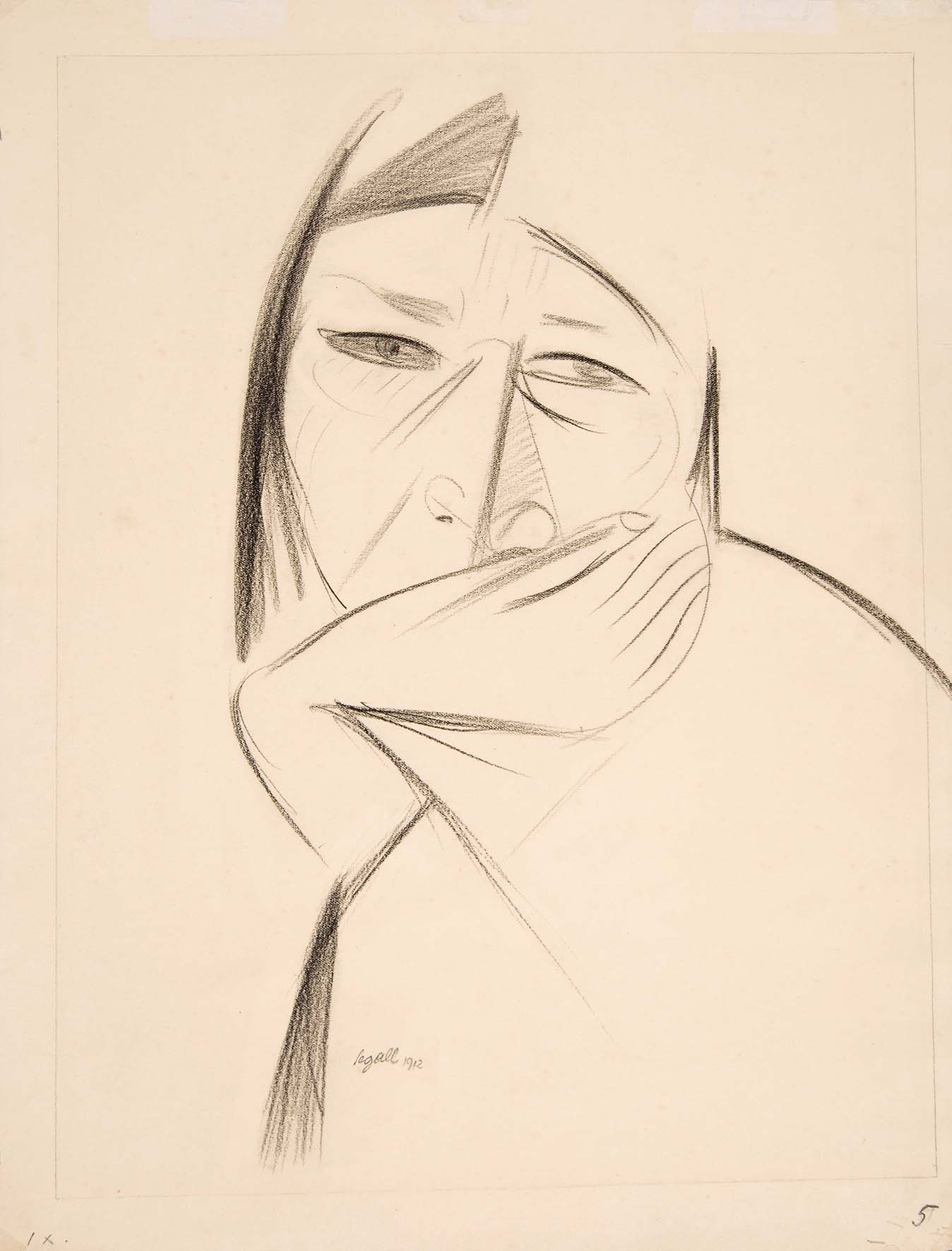 Composição em preto e branco (papel amarelado). Linhas superpostas quase chapadas, linhas finas e suaves. Composição representando meio busto de mulher ocupando a área central de composição. A figura parece ser uma velha que está com a cabeça de frente ligeiramente caída para esquerda e apoiada na mão esquerda, dobrada para tras, apoiada por sua vez no ombro esquerdo de perfil para esquerda, marcado por linha semi-circular, sugerindo um arqueamento nas costas. A figira tem cabelos pretos e lisos repartidos ao centro, sobrancelhas pequenas, olhos muito amendoados com olheiras demarcadas, nariz grande marcado por forte linha central com as narinas delineadas. A mão de dedos longos lhe encobre os lábios e o queixo. Usa provavelmente roupa de mangas compridas, sugerindo por feixe de linhas no pulso