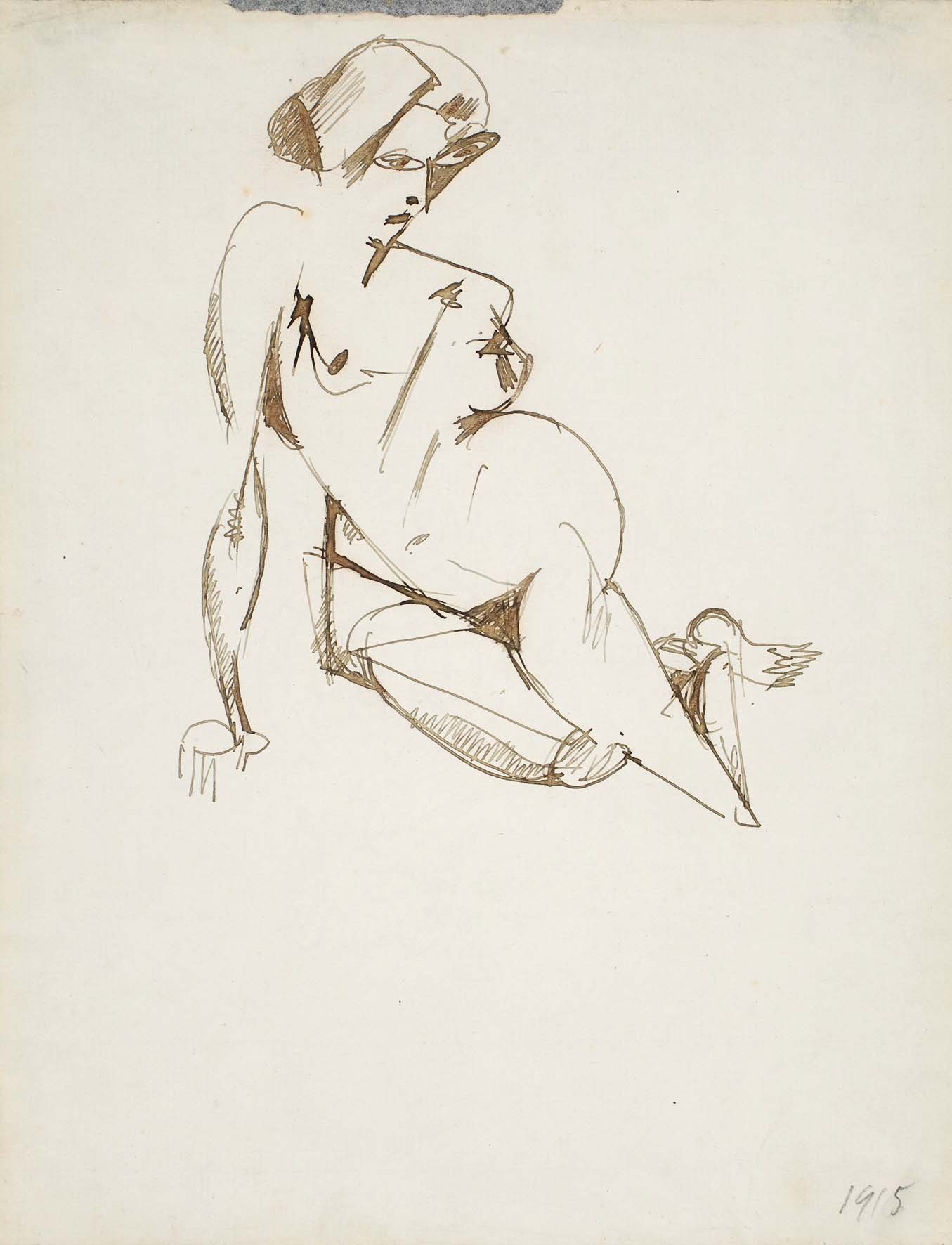 Composição em preto e branco do papel. Linhas rápidas, fortes, sinuosas e sobrepostas. Nú de mulher, ocupando a região superior do suporte, contra fundo liso. A figura está sentada sobre a perna direita e apoiada na mão direita espalmada no chão, com o corpo em ligeira diagonal da direita para a esquerda e da frente para o fundo. Está com a cabeça quase de perfil para a direita; parece ter os cabelos presos na nuca e traços fisionômicos sugeridos. Tem os seios indicados; nádega esquerda proeminente, púbis sugerido, pernas flexionadas, estando a esquerda sobre a direita a pés descalços. O braço esquerdo parece estar esticado apoiando o corpo por detrás da figura