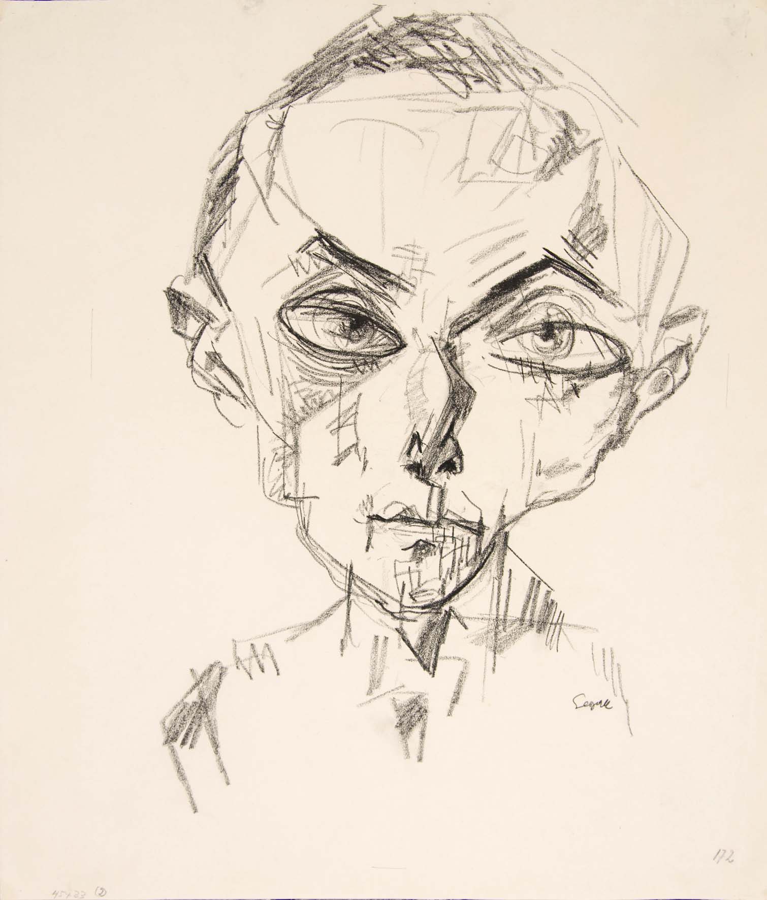Composição em preto e branco (papel amarelado). Linhas fortes, superpostas, largas de grafite deitado e ligeiros sombreados. Retrato de cabeça de homem ocupando a quase totalidade do suporte, contra fundo liso. O retrato está de frente e tem os traços fisionômicos deliberadamente deformados. Tem o cabelo sugerido por muitas linhas, testa larga, sobrancelhas em ângulo, olhos grandes amendoados, nariz pequeño e demarcado por ângulo, lábios finos fechados, orelhas sugeridas, queixo anguloso, sendo a face esquerda demarcada por aprofundamento da linha maxilar inferior. O pescoço e as linhas do ombro se confundem com sua possível vestimenta