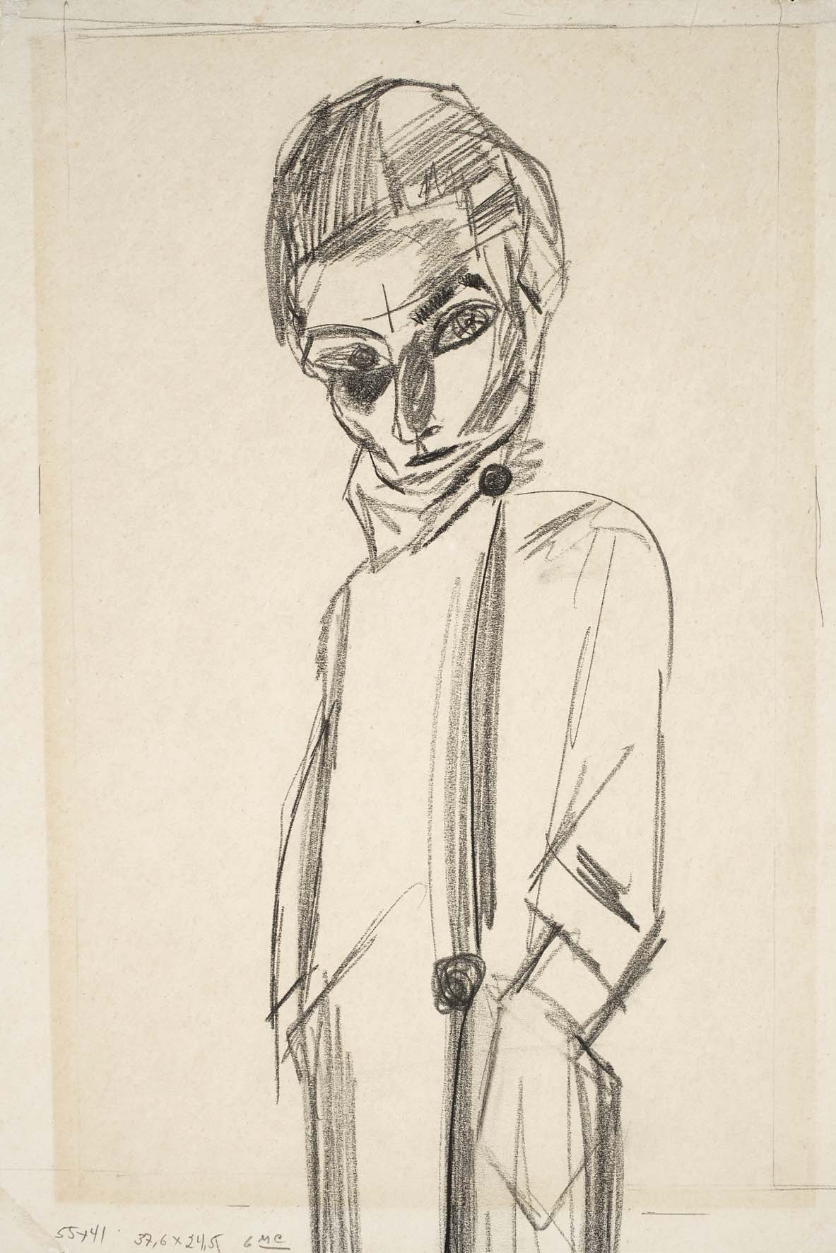 Composição em preto e branco (papel amarelecido). Traços fortes, linhas rápidas e superpostas. Composição representando figura de jovem ocupando a área central vertical da composição contra fundo liso. A figura está de pé com o corpo ligeiramente voltado para esquerda e com a cabeça de frente, ligeiramente voltada para baixo. Tem os cabelos indicados, olhos grandes olhando para direita, olheira demarcada no olho direito, nariz grande e reforçado por linhas escuras e lábios finos fechados. Usa espécie de casaco de gola alta, aberto no lado esquerdo e abotoado por grandes botões: um na gola e outro na altura do bolso. Está com os braços ao longo do corpo e com a mão esquerda no bolso