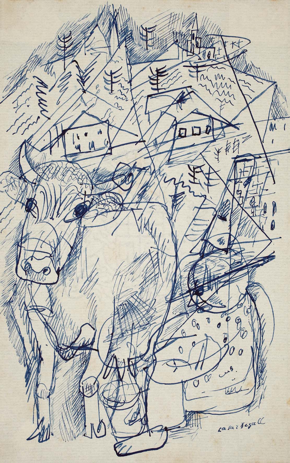 Composição em azul e branco (do papel). Linhas fortes, linhas superpostas, linhas sinuosas, circulares e suaves. Composição representando cena de uma ordenha, com uma vaca, homem, construções com montanhas e pinheiros, contra fundo de garatujas que contornam a composição. No primeiro plano, à esquerda, a vaca de pé, com a cabeça de frente, o corpo ligeiramente voltado para direita. Tem chifres, olhos, orelhas e fucinho sugeridos, patas dianteras demarcadas e as glândulas mamárias representadas com balde sugerido embaixo, onde provavelmente cai o leite que dela é tirado pelo homem que está à direita. O homem está sentado de perfil para esquerda, usa chapéu, tem a cabeça arredondada, traços fisionômicos sugeridos no perfil, usa camisa com bolinhas e tem os pés descalços. No segundo plano, sugestão de chalés do tipo suiço com telhados baixos, em meio a montanhas e pinheiros sugeridos. No fundo, garatujas de traços leves superpostos contornam a composição