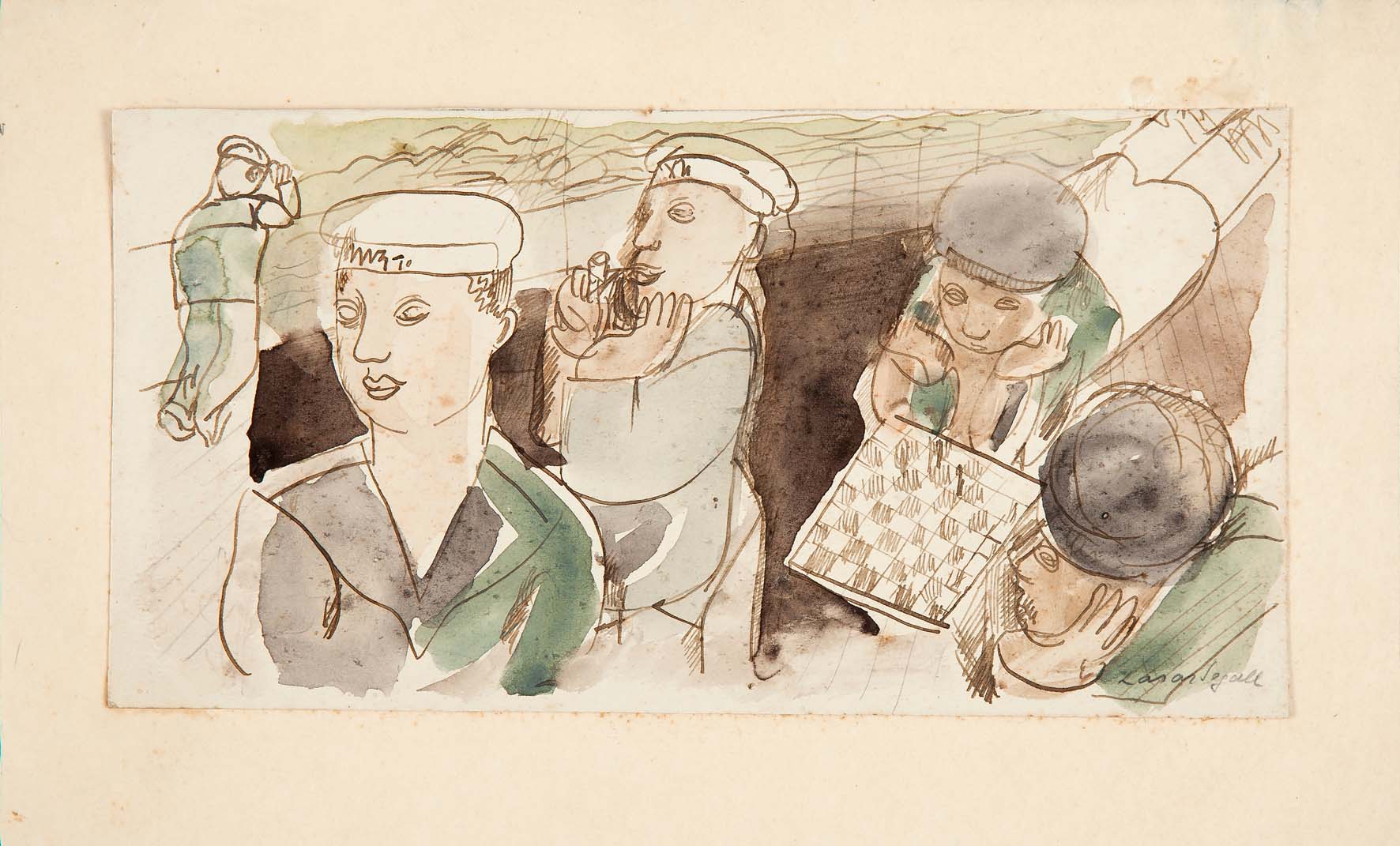 Composição nos tons terras, verdes, cinzas e branco do papel. Linhas de contorno em tinta sépia a pena e aquerela definindo as formas e aquarelados preenchendo os espaços, deixando em algumas áreas o papel aparente. Composição representando cinco marinheiros a bordo de um navio, em posições e atitudes diversas, com sugestão de mar ao fundo. No primeiro plano, à esquerda, meio corpo de marinheiro, de pé, de frente, com a cabeça ligeiramente voltada para esquerda, usando boné branco, com traços fisionômicos sugeridos e blusa de gola típica em tons verdes e cinzas. À esquerda do centro, um pouco mais atrás, marinheiro sentado de perfil para esquerda, segurando com a mão direita um cachimbo na boca e apoiando a cabeça com a esquerda; também usa boné e roupa de tons acinzentados. À direita do centro, marinheiro deitado em diagonal da esquerda para direita, da frente para o fundo, usando boné, com traços fisionômicos sugeridos, cabeça apoiada nas mãos diante de um tabuleiro de xadrez, com o qual parece jogar com o marinheiro à direita da composição. Deste só se vê a cabeça, de perfil para esquerda, com o boné e a mão sustentando a cabeça, com traços fisionômicos sugeridos. No segundo plano, à esquerda, marinheiro de pé, de costas, como se caminhasse; está com o braço direito erguido tirando o boné. No fundo sugestão de mar em tons verdes com ondas sugeridas em bico de pena