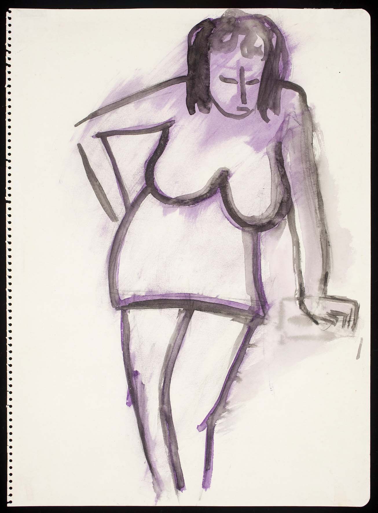 Composição em preto, violeta, cinzas e liláses e branco do papel (amarelado). Traços largos de pincel com aguada forte em preto, traços em tinta violeta a pincel e aguadas misturadas e áreas de utilização do pincel quase seco. Composição representando figura de mulher, ocupando a área central do suporte, com fundo marcado por aguadas em algumas regiões em torno da figura. A mulher está de pé, de frente, com o corpo ligeiramente caído para direita, sustentado pela mão esquerda, apoiada em uma forma quadrangular indefinida. Tem cabelos pretos densos, contornando a cabeça com sugestão de franja, rosto arredondado e traços fisionômicos sugeridos por traços. Está com a cabeça ligeiramente arqueada para baixo e encobrindo-lhe o pescoço. A figura está com o braço direito flexionado com mão por trás dos quadris; tem o seio exageradamente grande e caído, indicado por linhas fortes que salientam provavelmente através de uma camisola curta, sugerida por linha horizontal na altura das coxas e no contorno do quadril. Está com a perna esquerda por sobre a direita, sangradas no corte do papel, não se podendo ver os pés