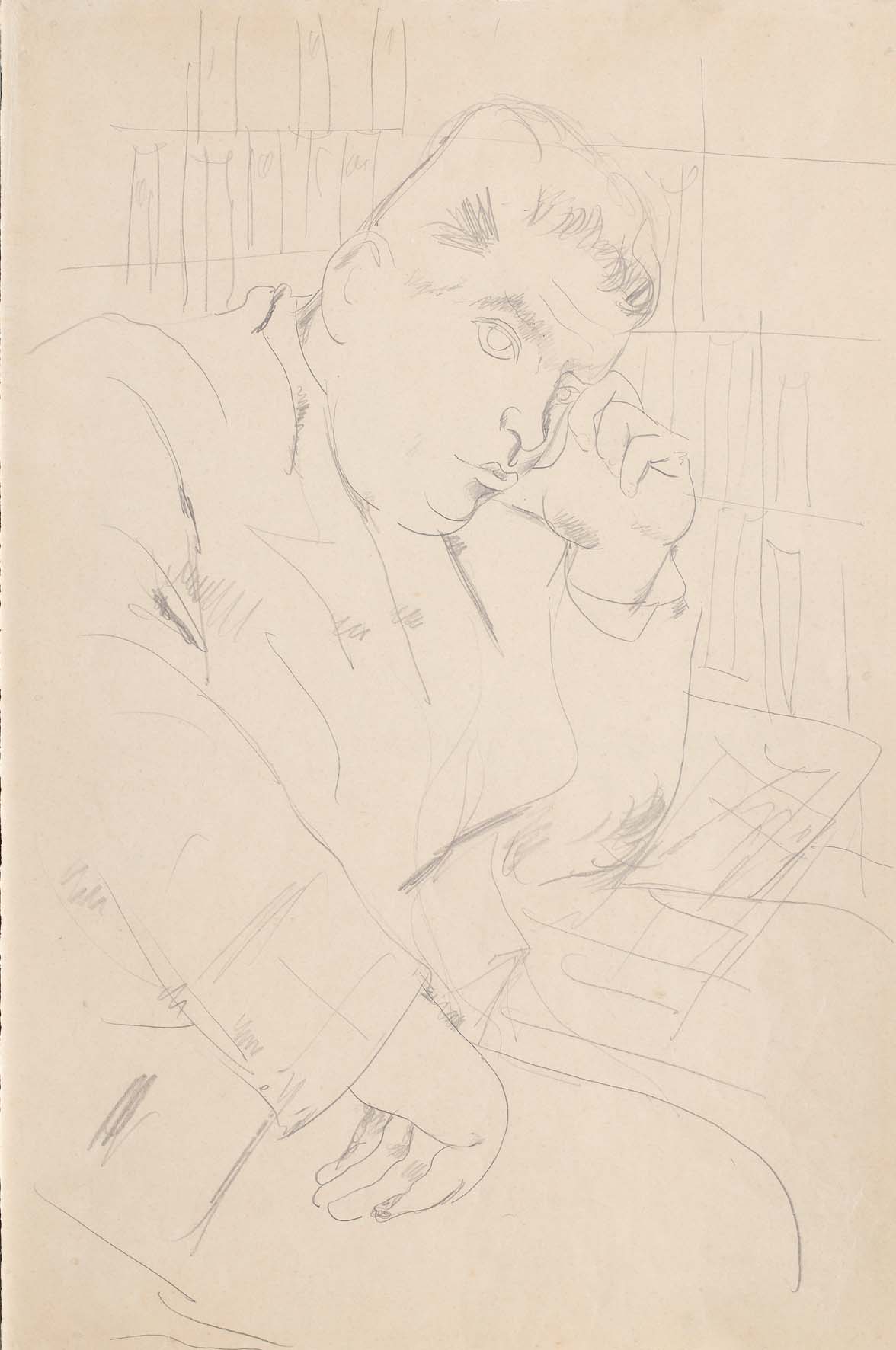 Composição em preto e branco (papel amarelado). Linhas rápidas, finas, superpostas e retas. Retrato de homem sentado ocupando a quase totalidade da composição com sugestão de mesa e estante com livros ao fundo. O retratado está sentado quase de perfil para esquerda, com a cabeça caída apoiada na mão esquerda entreaberta, de cujo cotovelo se apoia no que parece ser uma mesa ou escrivaninha com sugestão de papéis encima. O retratado é obeso, tem os cabelos curtos penteados para trás, sobrancelhas grossas, olhos pequenos, assim como o nariz, lábios pequenos e finos fechados, queixo arredondado e papada demarcada. Parece usar um terno sugerido pelo panejamento esboçado. Está com o braço direito ao longo do corpo e com a mão entreaberta apoiada na coxa direita. No fundo, traços horizontais sugerem uma estante e traços verticais paralelos sugerem os livros
